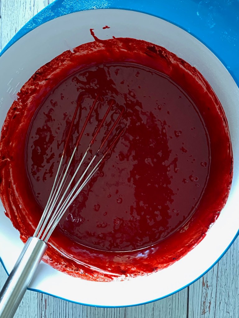 - Grab your large mixing bowl again and add in the buttermilk, vanilla, olive oil, vinegar, and red gel food color. Mix all contents together for a few minutes until fully mixed. You can use a hand whisk to make sure no large lumps remain. Cake batter should be smooth and easy to pour into the cake pans.